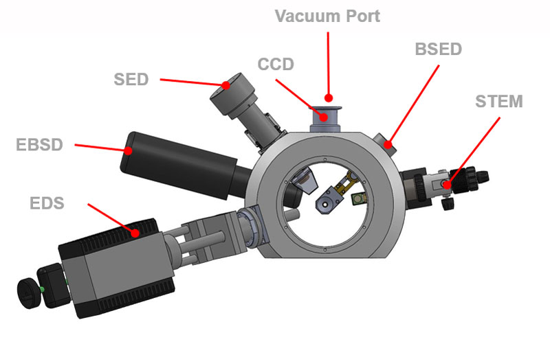 该cx - 200 +SEM到达标准标准,包括CCD腔室相机。SEM腔室提供10个配件端口。其中一些用于标准组件,如成像探测器和腔室相机。其他端口专为EDS和EBSD专门用于EDS和EBSD,而其他端口可用于诸如我们的Stem检测器,冷却阶段或其他定制功能的附件中。腔室允许样品大约160mm,减少舞台运动。