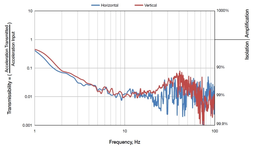 VAIS-AMT系统能够高效地将超精密仪器与1-10赫兹范围内的环境振动隔离开来,在这些环境振动敏感的精密仪器往往不稳定,并受到振动的干扰,无法产生最佳结果。VAIS-AMT系统在0.6Hz时开始隔离,在10hz时提供±99%的振动隔离。